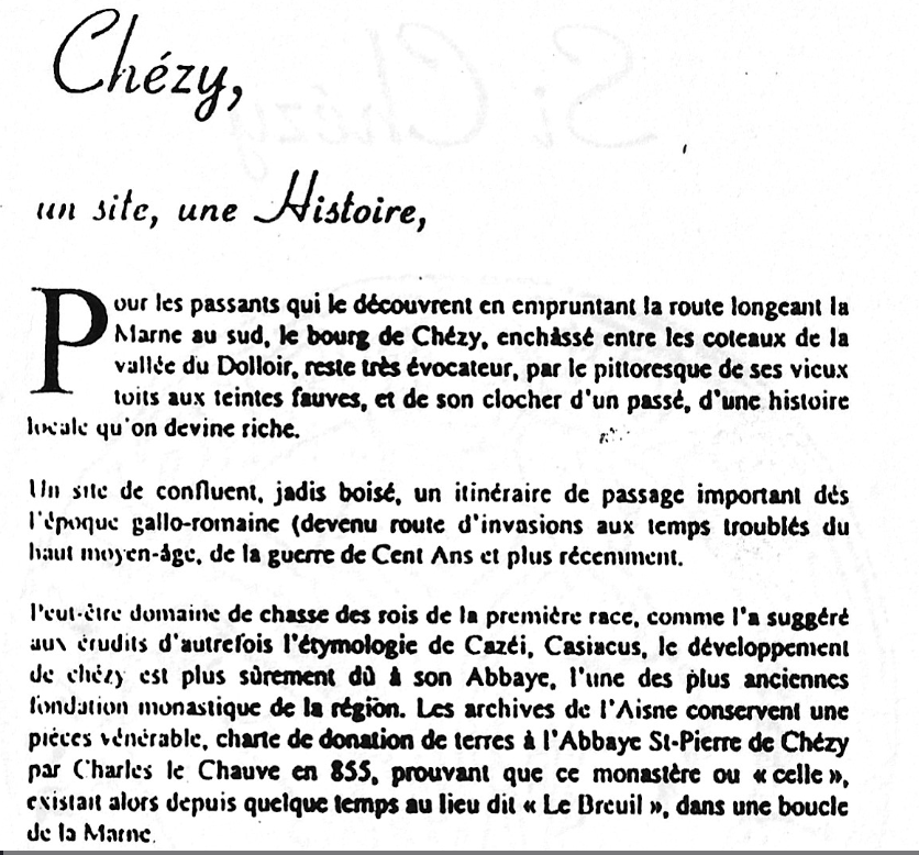 Une brochure retraçant l'histoire de Chézy-sur-Marne depuis sa fondation, centrée sur les églises, en passant par les guerres jusqu'à son …